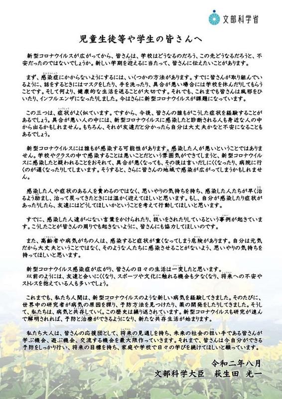 文部科学大臣メッセージ(新型コロナウイルス感染症関連)について