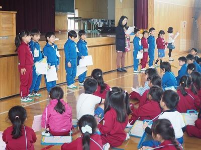 スタートは体育館です。2年生が探検のルールを説明しています。