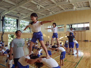 運動会に向けて、5・6年生が組体操の練習を始めました。組体操デビューの5年生に6年生がお手本を見せてくれました。難しい技がたくさんあるのですが、一生懸命練習をしていました。