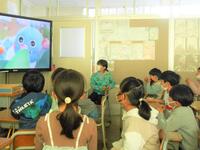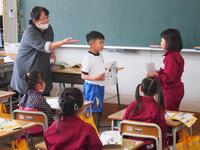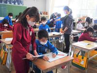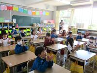 1時間目、1組は国語で自己紹介の練習をしていました。「私は、○○です。好きなものは、○○です。」と、一人ずつ自分の名前と好きなものを発表していました。2組は算数で、2つの絵を比べ、数に注目して違いを見つけていました。左側の絵の鳥の上におはじきを置き、右側の絵の鳥におはじきを移すことで、鳥の数が増えたのか、減ったのかを確認しました。