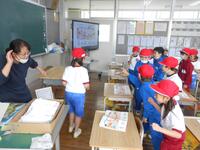 2組の算数は、おはじきを使って数の学習をしていました。ランドセルをロッカーに入れる場面で、ロッカーの数が足りるかどうかを確かめていました。多い、少ない、増えた、減ったなどの違いに気付く学習内容でした。