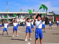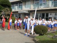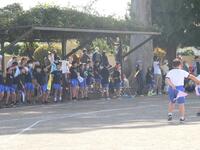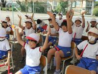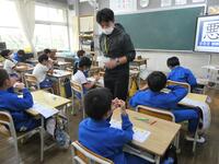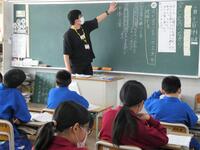 今週から教育実習生のT川先生は授業実践に入り、今日は6-1国語と道徳の授業を担当していました。写真は4校時、校庭で1・2年生の合同体育、3年生は音楽と理科、4年生は国語と道徳、5年生は書写と社会、6年生は国語と外国語の授業の様子です。