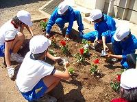 ロング昼休みに5・6年生が花の定植をしました。交通公園や、校舎の前、中庭の花だんにサルビアやマリーゴールド、日々草の苗を植えました。きれいな花が咲き続けるように、栽培委員会の人たちを中心にしっかり世話をしていきたいです。