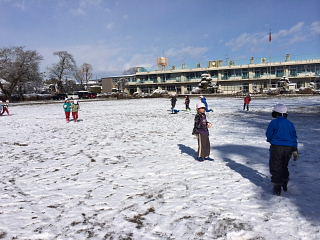 昨日の雪が午前中、校庭にたくさん残っていました。休み時間や体育の時間に雪で遊びました。さらさらの雪で雪玉が作りにくかったです。帰る頃には、すっかりとけてしまい、みんな少し残念そうでした。