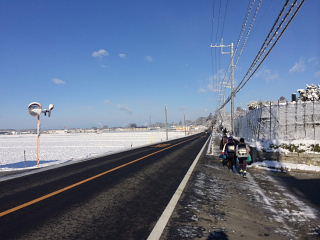 登校中 歩道に雪がたくさん残っていました。畑にもたくさんの雪が積もっていました。