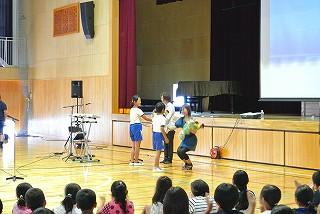 3校時に防犯教室がありました。真岡警察署のスクールサポーターと七井駐在に来ていただき、不審者に対する対応の仕方をDVDや劇を通してわかりやすく教えていただきました。知らない人にはついて「イカ」ない。知らない人の車には「の」らない。連れて行かれそうになったら「お」おきな声で「す」ぐ逃げる。大人に「し」らせる。これを「イカのおすし」と言います。代表の3年生児童3名が不審者から逃げる劇を堂々と演技することができました。また。スクールサポーターの先生、そして七井駐在さんにはたいへんお世話になりました。今日の学習をしっかり覚えて、安全で健康な夏休みを過ごしたいと思います。