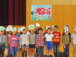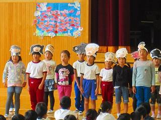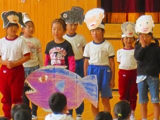 2年生 スイミー 自作のお面をかぶってのテンポ良い発表でした。ことわざも1人1つ発表することができました。