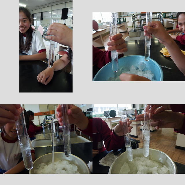 今日のクラブの時間に科学クラブでは、過冷却(かれいきゃく)の実験を行いました。過冷却とは、0度以下に下がっても凍らない水に刺激を与えると一瞬で凍る現象です。今日は、塩を入れて温度下げた氷の中に水の入った試験缶を入れ、よく冷やしました。その試験管の中に、氷のかけらを一つ入れて刺激を与え、試験管内の水を一瞬で凍らせました。何度も失敗を重ね、最後にほとんどのグループが成功しました。何度も失敗を重ねて成功が生まれることを学びました。