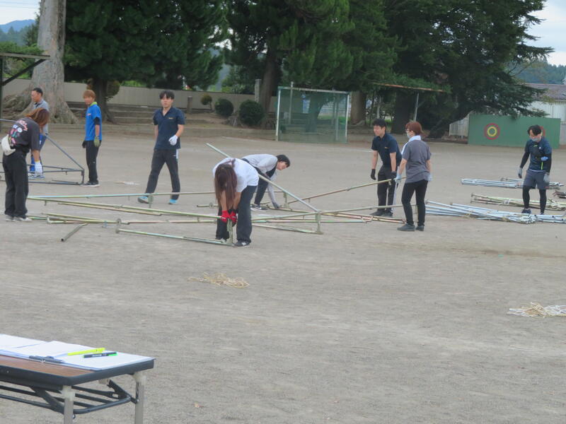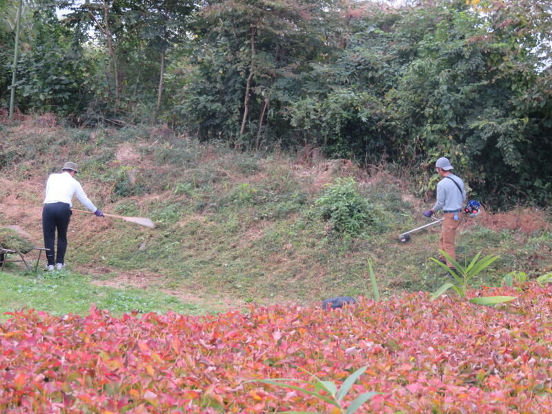 第2回奉仕作業では、運動会用のテント設営、トイレと池の掃除、タンポポ畑の草刈りを行いました。