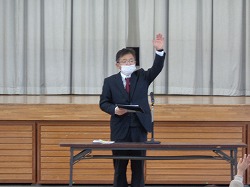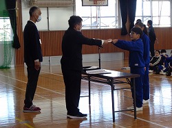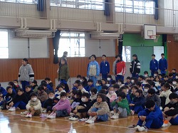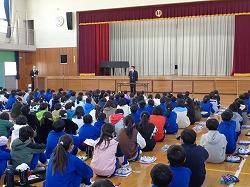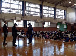業間に持久走大会の表彰を行いました。入賞者の名前を呼んだ際に、「はい」と元気よく返事ができていました。表彰の後、校長先生から持久走大会のがんばりや、食品ロスについての話をしました。