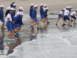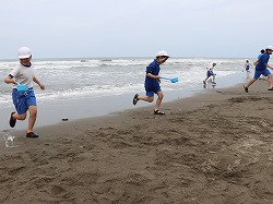 波打ち際で遊んだり、塩水くみリレーをしたりと、砂浜活動を行いました。そのあとに、グループごとに砂で作品作りに取り組みました。