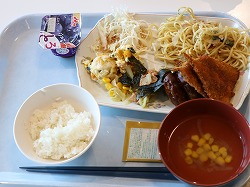夕食は、ハンバーグ、アジフライ、サラダ、スパゲッティ、ごはん、みそ汁などでした。