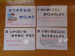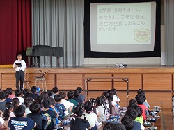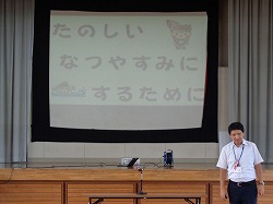 児童指導主任、学習指導主任から、1学期のふりかえりと、夏休み中の生活や学習の仕方についての話をしました。