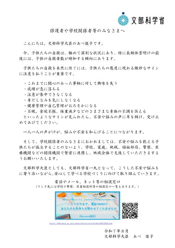 文部科学大臣から、全国の児童生徒や学生のみなさん、保護者等のみなさんに向けた、自殺予防に係るメッセージが届いています。