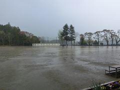 朝からどしゃ降りの雨です。校庭も池になってしましました。
