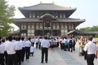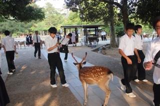 東大寺の大きさに生徒たちは圧倒されていました。鹿との触れ合いも楽しめたようです。バスはただいま宿に向かっています。
