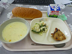 本日の献立は、コッペパン、牛乳、りんごジャム、タンドリーチキン、チーズ入りフレンチサラダ、コーンポタージュでした。たまねぎの甘みがしっかりと出ていたコーンポタージュでした。