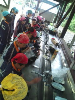 カレー作りが終わりました。みんな頑張っておいしくできました。多くの班が食べ終わりました。