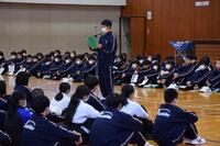 校庭での実施ならば、車と自転車の衝突事故や巻き込み事故の実演を見る予定でしたが、体育館の実施ということもあり自転車同士や自転車と歩行者の衝突等について実演をしていただきました。生徒は真剣に見て、感じて、交通安全に対する意識を高めることができたと思います。