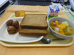 本日の献立は、黒色パン(2枚)、牛乳、はちみつ&マーガリン、野菜いろいろ肉団子(3つ)、フルーツポンチでした。今日は真夏日ですが、冷たーいフルーツポンチが最高でした\(^O^)/。