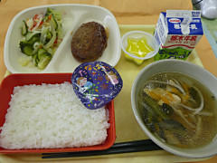 本日の献立は、ごはん、牛乳、ハンバーグケチャップソース、カラフルサラダ、七夕スープ、七夕ゼリーでした。スープの中に星形のにんじんが入っていた人は当たりです。皆様一人一人の願いが叶いますように!!ヾ(^v^)k
