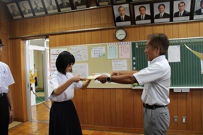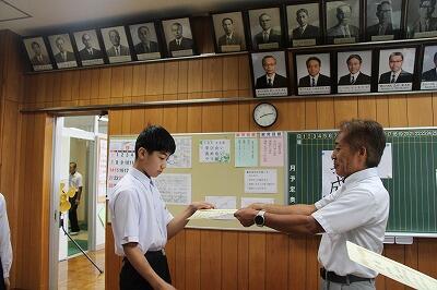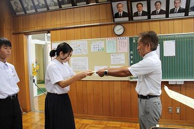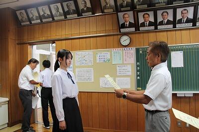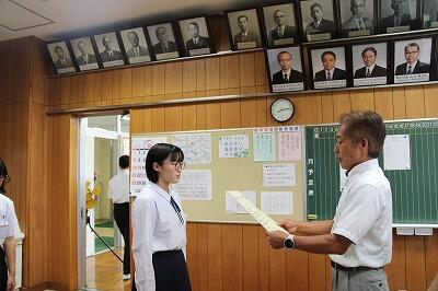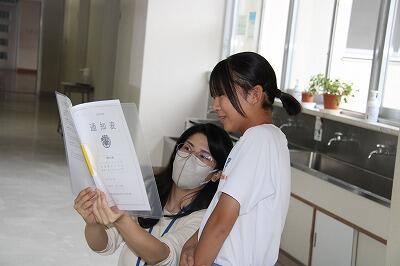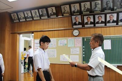 今日は前期通知表の配布日です!生徒の関心は高く、担任の先生から通知表が渡されるまで、皆ドキドキして待っていました。特に、1年生では中学校初めての通知表でしたが、担任の先生からのアドバイスを聞きながら、通知表を食い入るように見ていました。5段階の評定が気になるのは分かりますが、観点別の評価や行動の記録、所見、表彰等、評定以外もよく見て、自分のできたところ、がんばったところと改善していくべきことを確認し、今後の生活に生かしてほしいと思います。保護者の皆様もぜひ、お子様のよいところ、がんばったところを褒めてあげてください。