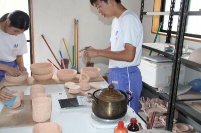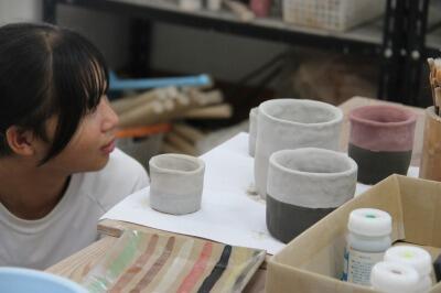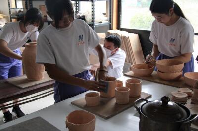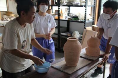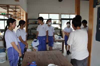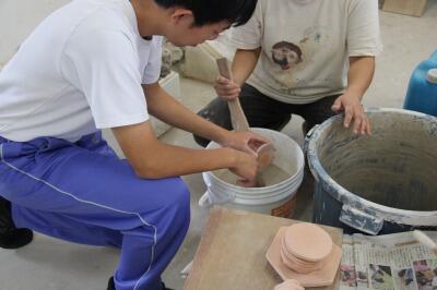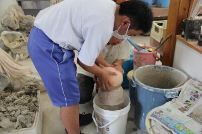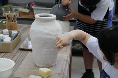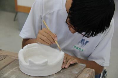 益子中学校・陶房にて、夏休みに作成した作品の釉薬がけを行いました。2カ月ぶりの対面に生徒は素焼きした自分の作品に見入っていました。