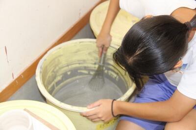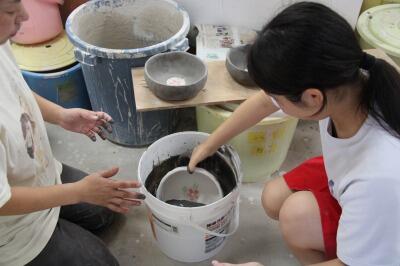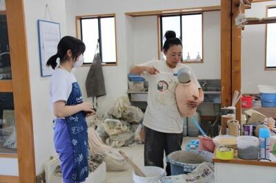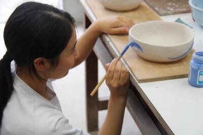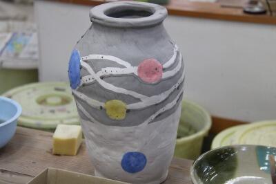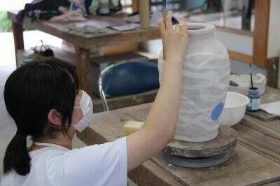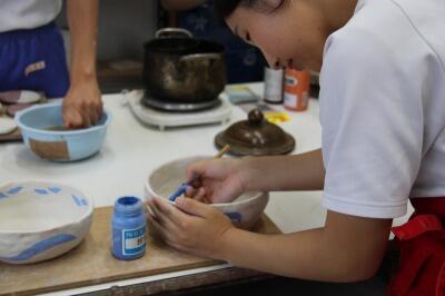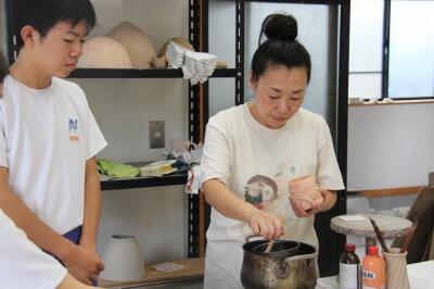 講師の榎田先生から手ほどきを受け、紙やすりがけ、表面の拭き取り、そして、釉薬がけ、絵付けを行いました。完成までは、まだ時間が掛かります。できあがりが楽しみです。