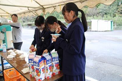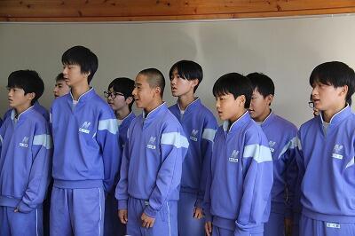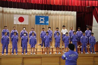 学校出発時には、「七井中魂」の応援旗を掲げた3年生と保護者からの見送りというサプライズがありました。