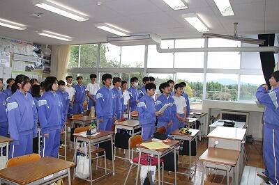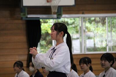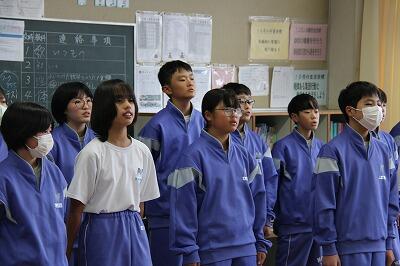 本日の朝会は、リモートで校長先生から講話をしていただきました。今回の講話のテーマは「『探求的な見方・考え方』を身に付けることの大切さ」でした。「天高く馬肥ゆる秋」のことわざをもとに、「本当に秋の空は澄み渡り、高く見えるのか」、雲の発生の様子を炭酸水の入ったペットボトルを使った実験をもとに検証してくださいました。講話を通して、探求的な考えをするためには、「なぜそうなるのだろう、本当にそうなるのだろうか」といった疑問を持つこと、そして生じた疑問を解決することで新たな学びが生まれ、より深い学びにつながることを伝えてくださいました。生徒たちはみな、真剣な態度で講話を聴いていました。
