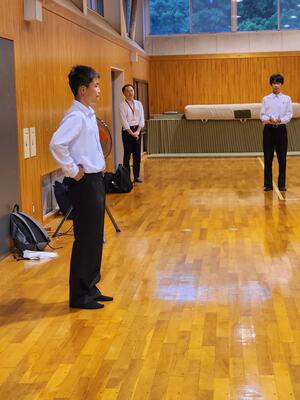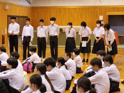 各部の決意表明では、今週から行われる郡市総体に向けて、大会への意気込みを堂々と発表しました。明日の郡市総体陸上大会に参加する特設陸上部からは、今まで練習時間の確保のために清掃を免除して練習に専念させていただいたこと、温かく応援してくれたことへの感謝のことばがありました。また、吹奏楽部からは運動部への応援メッセージと応援歌として「ケセラセラ」(「どうにかなるさ」という意味だそうです)の曲の演奏がありました。