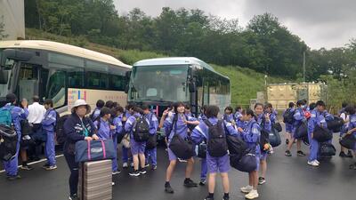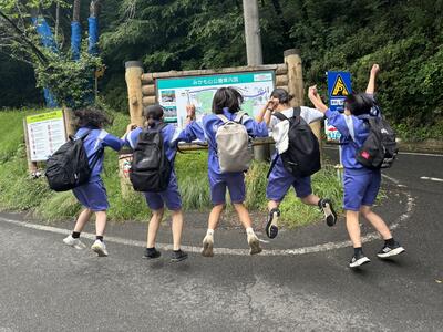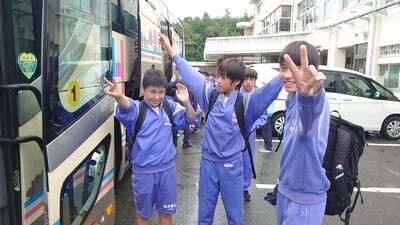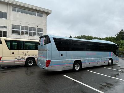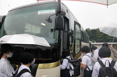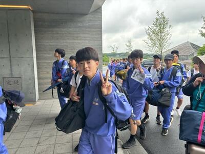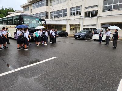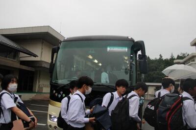2学年、みかも自然の家への宿泊学習が今日から始まります。あいにくの天気ですが、生徒はみな元気です!ただいまから出発します。