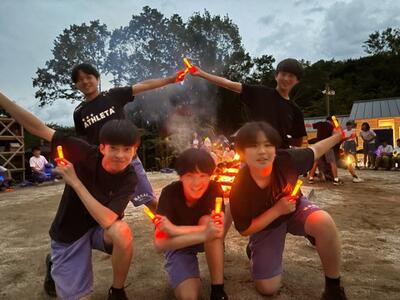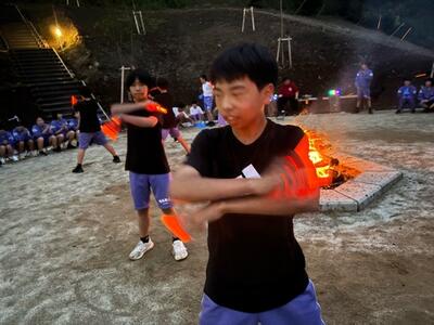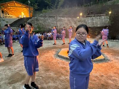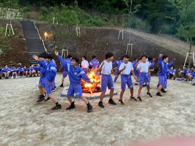 2学年の生徒が1番楽しみにしていたキャンプファイヤー。まるでコンサート会場にいるような盛り上がり。でも、時間は守り、最後の後片付けも完璧。最後は実行委員長のTさんのダンスに土屋先生のボーカルでチューチュートレイン。感動が少しでも伝われば幸いです。