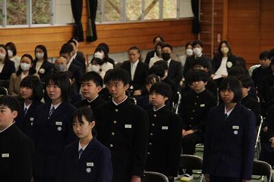 令和6年度の入学式を教育長様を始め、来賓の方々、多くの保護者にご出席いただいた中、挙行することができました。新入生は緊張もあったかと思いますが、担任の先生の呼名に大きな返事で応え、また、式中の態度も大変立派でした。また、2,3年生も新入生を温かく迎え入れ、校歌を大きな声で歌う姿は先輩としての自覚が感じられました。式後は天気も回復し、保護者の方を交えて入学の記念写真を撮ることができました。1年生の皆さん、今日はとても疲れたことでしょう。皆さんのキラキラした瞳にこれから始まる中学校生活へのやる気が伝わってきました!また、保護者の皆様、改めましてお子様のご入学、おめでとうございます!保護者の皆様、地域の皆様と連携し、協力し合いながらお子様の健全育成に全職員で取り組んで参ります。今後とも本校の教育活動へのご理解とご協力の程、よろしくお願いします。
