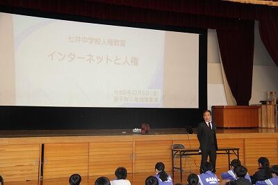 本日の6校時に人権擁護委員の方々にご講話いただき、人権集会を行いました。テーマは「インターネットと人権」。SNS等による誹謗中傷やネット被害は対岸の火事ではありません。生徒たちは今日の講話を通して、ネット被害にあわない、加害者にならないためにどうすべきか考えるよい機会となりました。ご家庭でも今日の人権集会を話題に取り上げてくださり、インターネットの活用の仕方についてお子様と一緒に再確認をしていただきたいと思います。