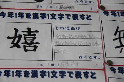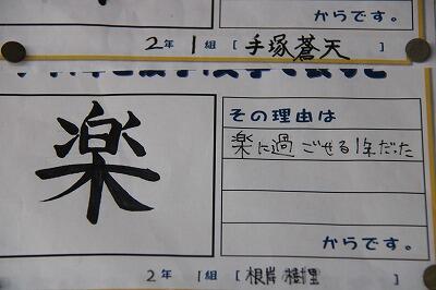 七井中学校では、体育館への渡り通路掲示板に、生活安全委員会によって全校生徒による「今年1年を漢字1文字で表すと」のカードを掲示しました。生徒一人一人、それぞれ思いを込めて漢字1文字を記入してくれましたが、学年によって書かれている漢字も異なり、とても興味深く拝見させていただきました。全体的に、「楽」と「友」が多かったように感じます。掲示板の一部をご紹介いたしますが、学校にお越しの際は、ぜひ1度、掲示板をご覧になってください。