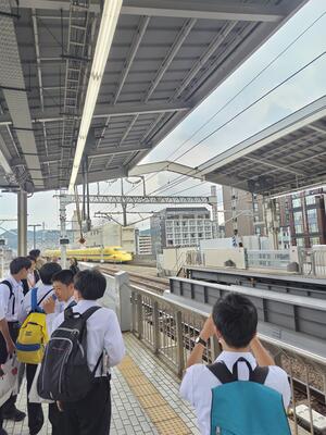 新幹線の到着までもう間もなく…というところで、なんとドクターイエローが!生徒たちは大急ぎでカメラを取り出し、撮影していました。