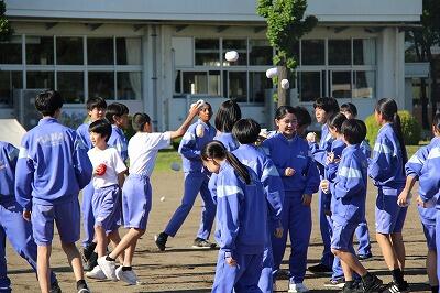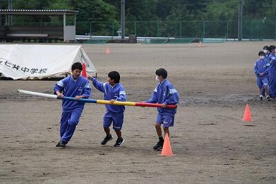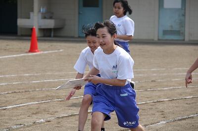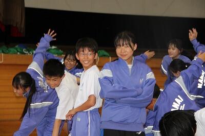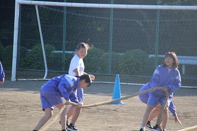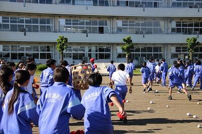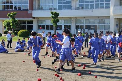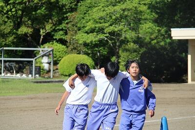 今日は晴天にも恵まれ、澄み渡る青空の下、運動会練習を行うことが出来ました。1年生の学年練習では、団体種目の「台風の目」を練習していました。