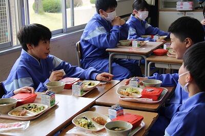 1年生の給食の様子です。配膳もスムーズに行っています。「今日は1年生の入学祝い給食だね!」と声をかけると、「中学校は量が増えているんですよね?鶏肉、あと5枚はほしいです!」との返答。生徒が大好きな鶏肉のレモンソースがけだったので、その気持ちは分かります...。お赤飯も出て、みんなでおいしくいただきました。ごちそうさまでした。