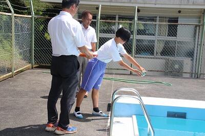 今日は気温が30度を超え、教室では1日中エアコンをかけた状態でした。このような暑い日はプールが最高ですね!今日の昼休み、代表の生徒会役員が参加した中でプール開きを行い、生徒が安全にプールを利用できるようお祈りしました。今週から体育の授業ではプールが始まります。生徒の皆さんは楽しみなことだと思いますが、安全には十分気をつけてくださいね。保護者の皆様もご指導の程、よろしくお願いします。 生徒が安全に利用できますように…