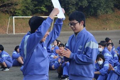 今日は生徒会主催のもと、ふれあい活動として縦割りによるドッジボール大会を晴天の下、行いました。学級対抗ではなく縦割りによるチーム編成をしたことで、1年生から3年生が協力し合いながら、楽しく活動することができました。結果発表では、優勝してもいつもおとなしめな生徒たちが感情を表に出して、優勝をみんなで喜び合っていました!