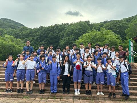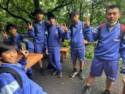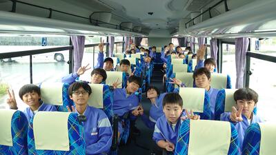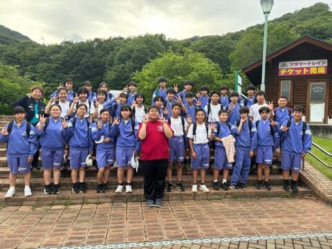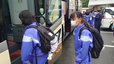 2学年、みかも自然の家への宿泊学習が今日から始まります。あいにくの天気ですが、生徒はみな元気です!ただいまから出発します。