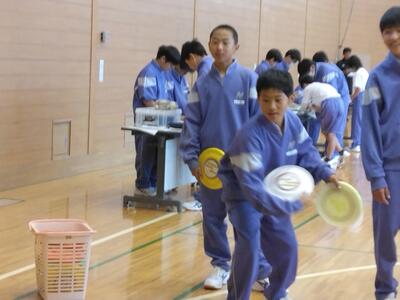 1年生の給食の様子です。配膳もスムーズに行っています。「今日は1年生の入学祝い給食だね!」と声をかけると、「中学校は量が増えているんですよね?鶏肉、あと5枚はほしいです!」との返答。生徒が大好きな鶏肉のレモンソースがけだったので、その気持ちは分かります...。お赤飯も出て、みんなでおいしくいただきました。ごちそうさまでした。