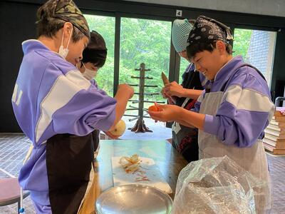 役割を決め、お米を研いだり、野菜を切ったりしています。時には玉ねぎに涙しながら頑張っています。