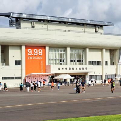 今回、全国大会が行われる福井県営陸上競技場は、2017年、当時東洋大学の桐生祥秀選手が、日本人で初めて100mを9秒台(9秒98)で走った競技場で、9.98スタジアムとよばれています。