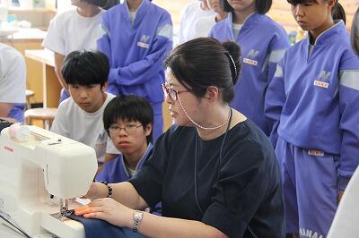 [4校時 2-2 家庭科]ボランティアの方にもご指導いただき、ミシン縫いの作業を行っていました。教頭先生の説明を、みんな真剣に聞いていました。