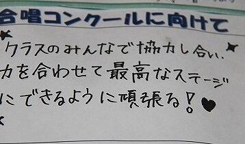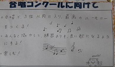 体育館への渡り廊下前の掲示板には、生徒たちの「合唱コンクールに向けた決意」が掲示してあります。今回はその一部をご紹介いたします!どのクラスも気合いが入っています!