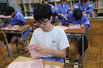 本日の6校時、前期通知表が担任の先生から生徒に渡されました。1年生にとっては中学校初めての通知表。生徒たちは担任の先生からアドバイスをいただきながら、気になる評定に見入っていました。保護者の皆様からも通知表から生徒のよい面、がんばった面をぜひ褒めていただき、さらに成長できるようにアドバイスをいただけますようお願いします!