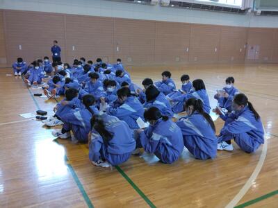 また、6校時終了後に竜巻避難訓練を行いました。2,3年生は昨年度も実施しているためか、スムーズに避難し、身を守るための姿勢(頭を守り、身をかがめる)を取ることができました。1年生は多少時間がかかりましたが、先生の指示に従って、隊形を作ることができました。