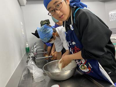 役割を決め、お米を研いだり、野菜を切ったりしています。時には玉ねぎに涙しながら頑張っています。